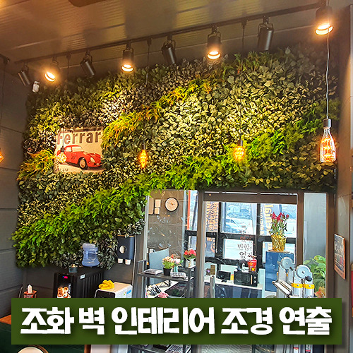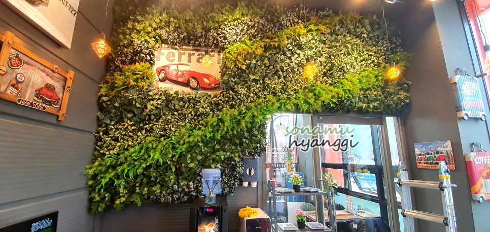 매장 한켠에 조화 벽 인테리어로 맑고 시원한 숲 같은 분위기를 띄도록 바꾸었습니다.