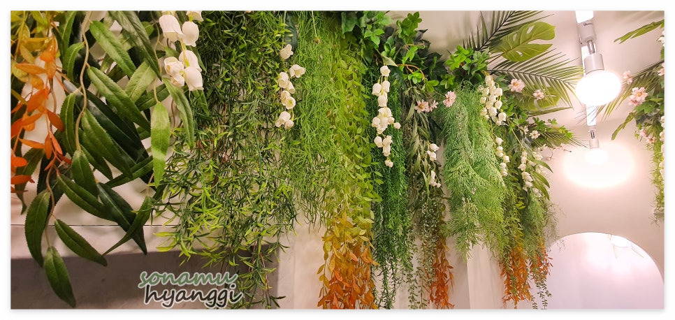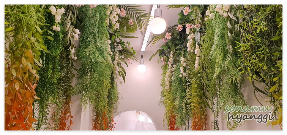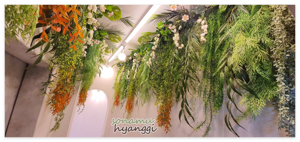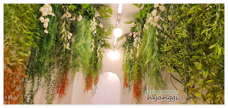 긴 천장의 길을 따라 다양한 종류의 녹색 조화와 길게 내려오는 조화를 사용해 인테리어를 했는데요.