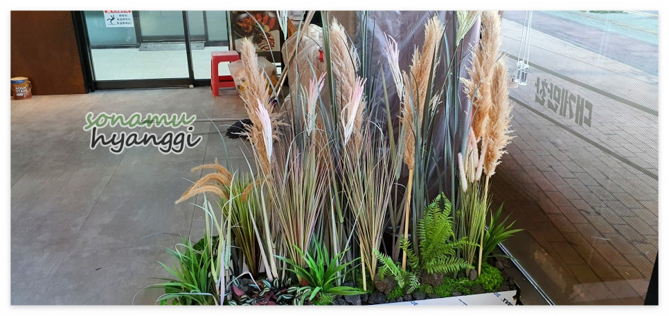 갈대의 키를 다양하게 연출해드렸고 주변으로 조화 식물들을 빙 둘러서