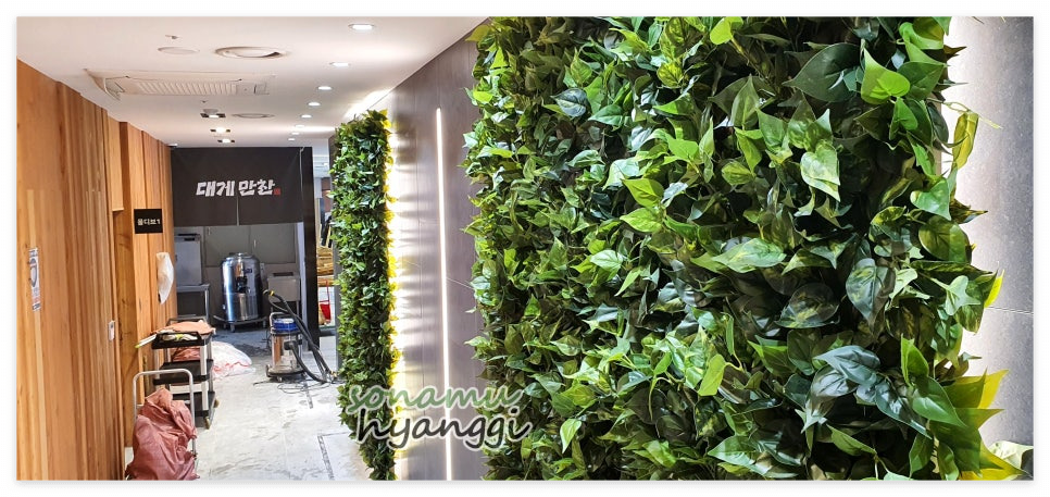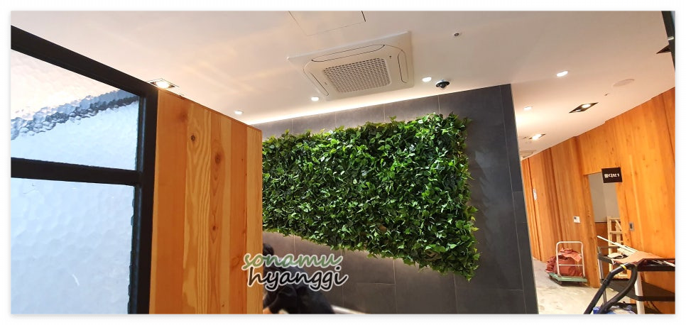 뒤로 길게 벽면을 따라 마찬가지로 조화 잎을 넣어 식물이 자라난 것 같은 자연스러움을 주었습니다.